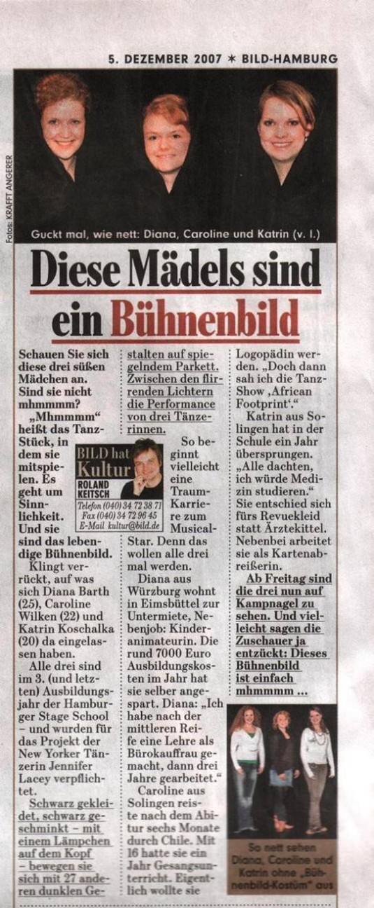 (...) Zwei Bühnenarbeiter kamen plötzlich auf die Idee, in die Rollen von Max und Moritz zu schlüpfen – und so begann das Stück. (...) Diana Barth als Moritz und Markus Veith alias Max lebten ihre Rollen im wahrsten Sinne des Wortes aus, sprühten förmlich vor Engagement und rissen die Kinder mit. „Ziel ist es schließlich auch, die Kinder zu animieren, kreativ und spontan zu sein“, erklärt die Regisseurin. Der Funke sprang sofort über, was die Schauspieler und besonders Barbara Pittner sichtlich freute.(...)