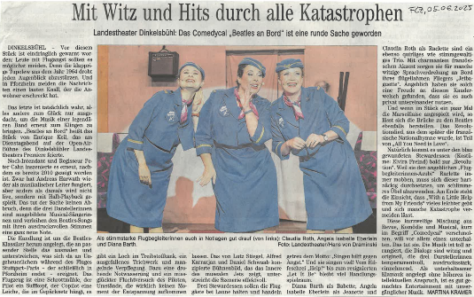 (...) Eigentlich fehlt diesem Musical der sonst übliche Ohrwurm, doch das machen die Akteure durch ihr komödiantisches Talent und vor allem die beiden Damen durch ihre stimmlichen Fähigkeiten wieder wett. Vor allem bei den Ensemblestücken kam echtes Musical-Feeling im Kulturzentrum auf. Bei dieser Vergnügungsreise bot das Programm so ziemlich für jeden etwas, der nicht gerade als Bildungsbürger eincheckte (...)Die als Lied verpackte Aufforderung ‚Fahr mal hin’ könnte durchaus auf das Musical selbst übertragen werden. Denn HILFE, WIR MACHEN URLAUB“ ist vergnügliche, leichte Unterhaltung für einen warmen Sommerabend, der nicht einmal ein wetterbedingter Hotelwechsel etwas ausmachen kann.“
